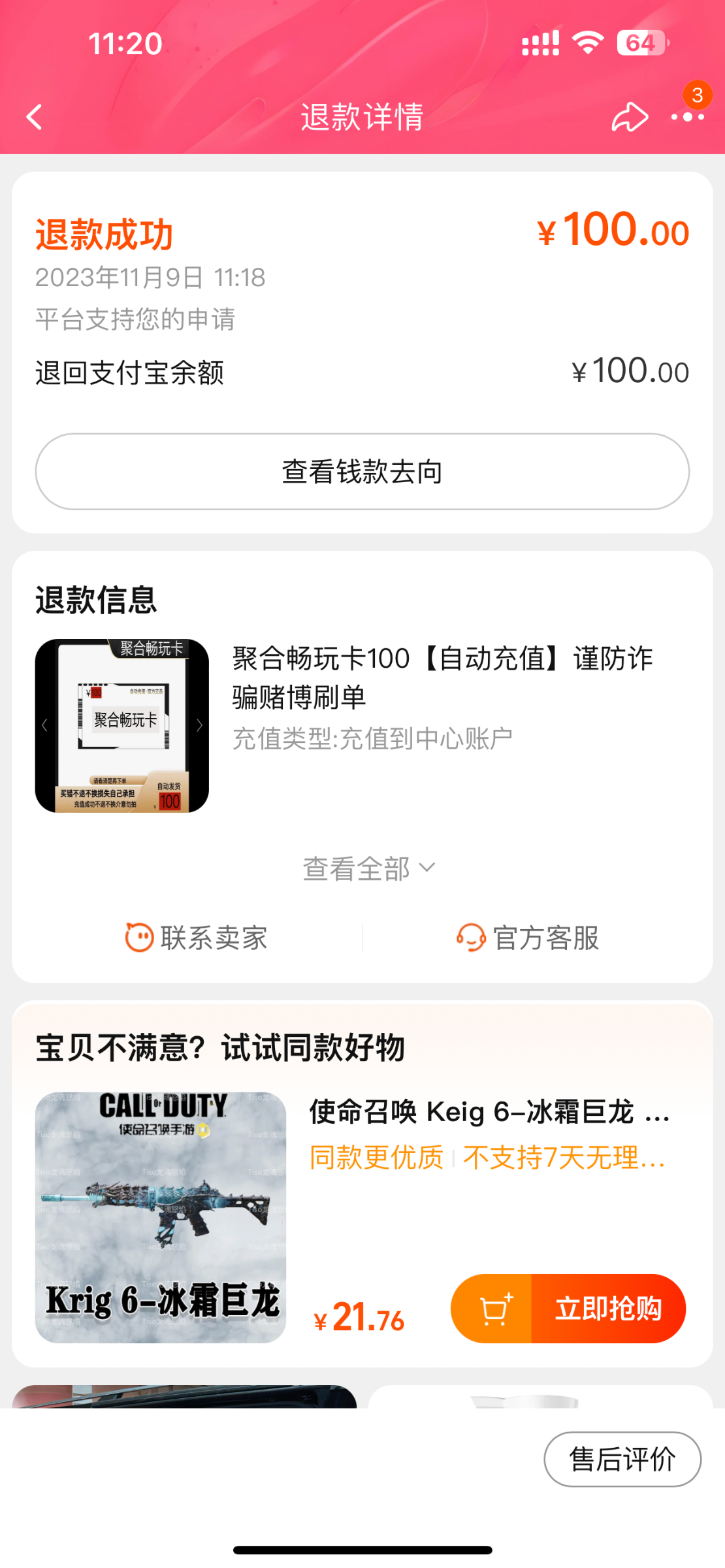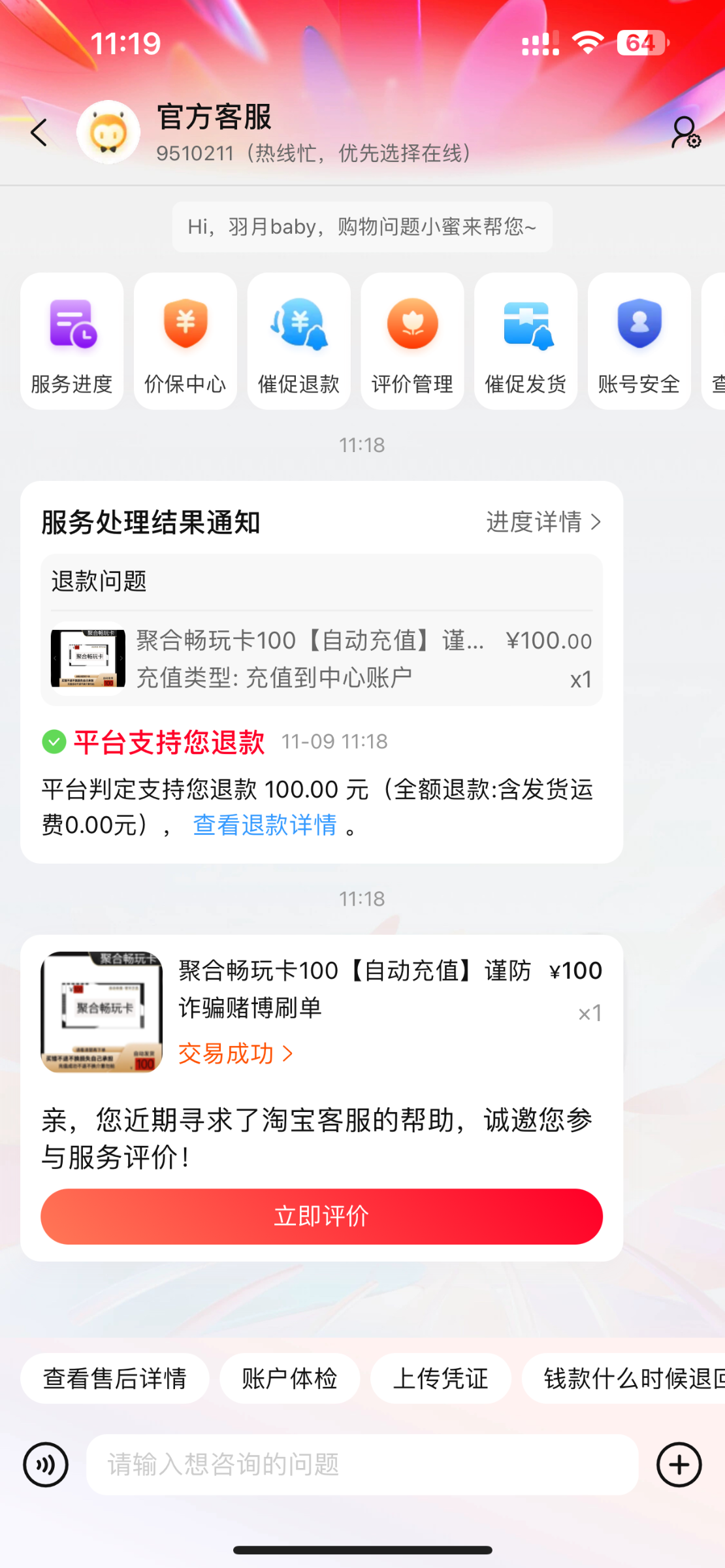 聚合卡充值的可以申请退款,只要你上完分,他下架了商品就可以直接申请退款,商家拒绝申请客户介入,然后说这个商家搞诈骗,买完虚假发货心虚了立马下架了商品,淘宝客户直接给你退钱