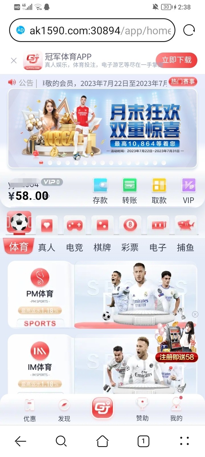 注册绑定姓名手机号码与银行卡 优惠里找到开业大庆典 申请58元 6倍流水 申请后48小时内送到福利中心领取 没有无视 跟完美体育差不多