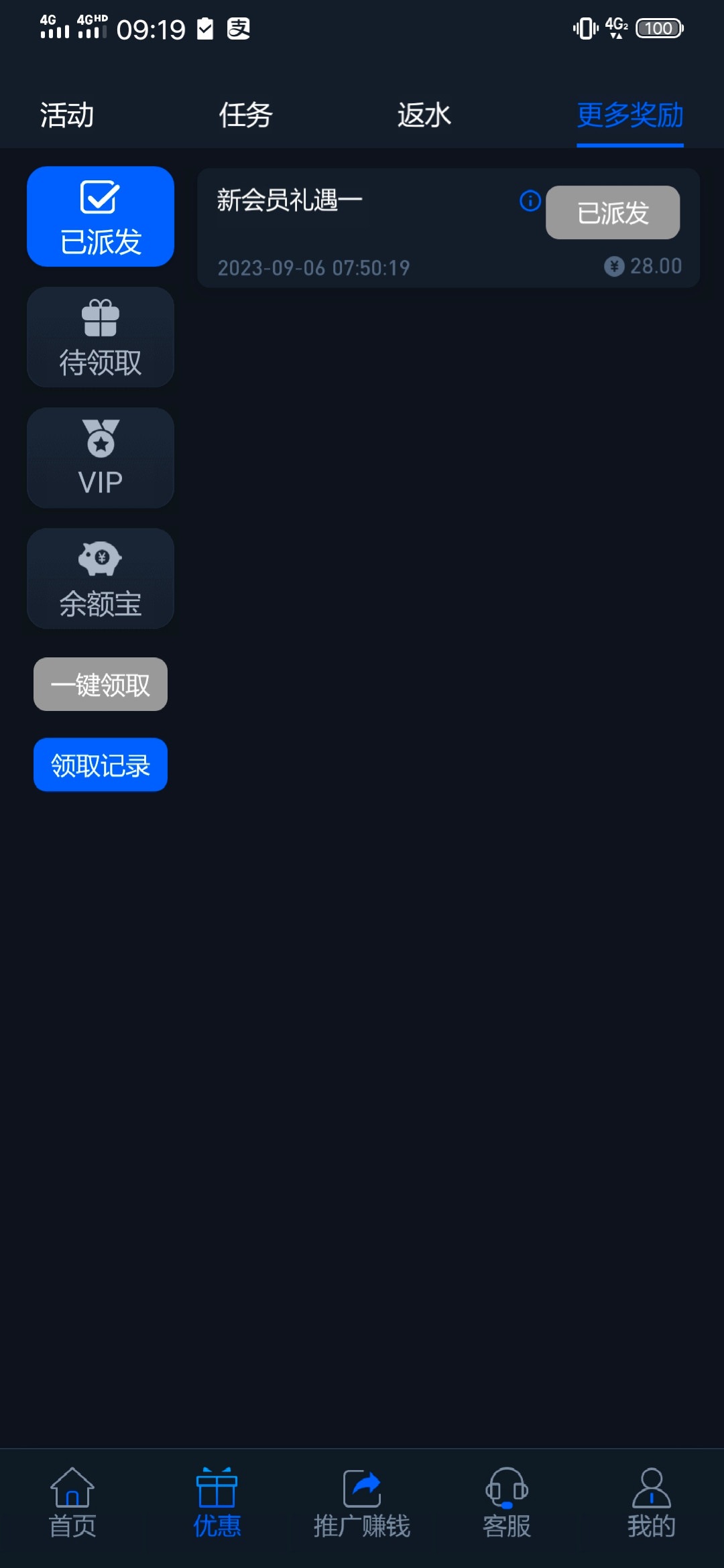 注册下载APP绑定手机银行卡信息,优惠里自助申请28彩金,半个小时左右到账。打到七百没提,输到五百提了,还没到账不知道有没有用。为了保险充了五十,充的打到一百多打光了。