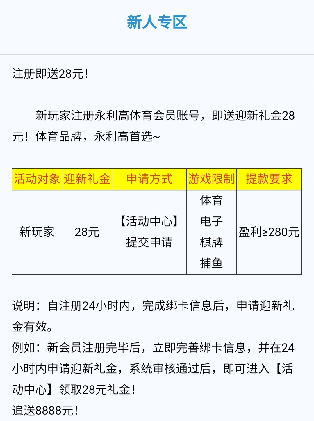 限制体育/电子/棋牌/捕鱼,最低280提现。