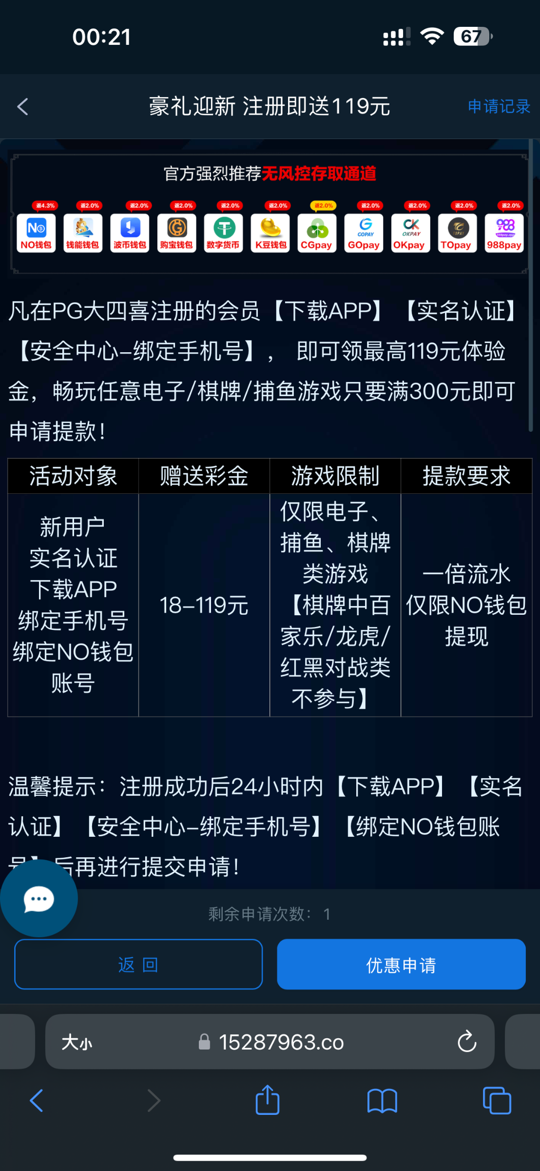 活动:新用户下载APP注册完善资料绑定NO钱包优惠活动里自助申请18~119彩金限制电子捕鱼棋牌最低300提现