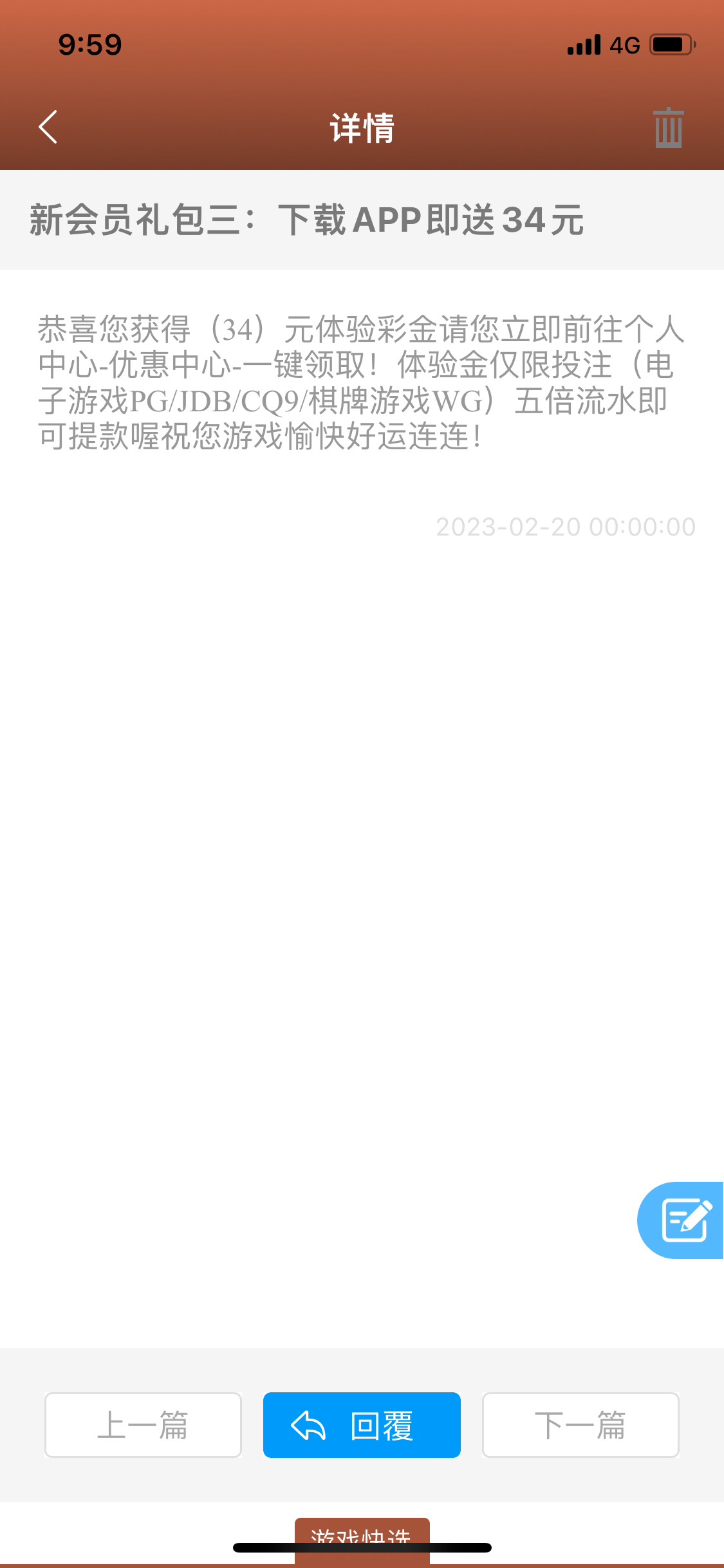 新用户注册完善资料一个小时左右自动送19,两个小时这样去优惠中心里面领,这种的就是随机送,仅限电子游戏,最低104提现。