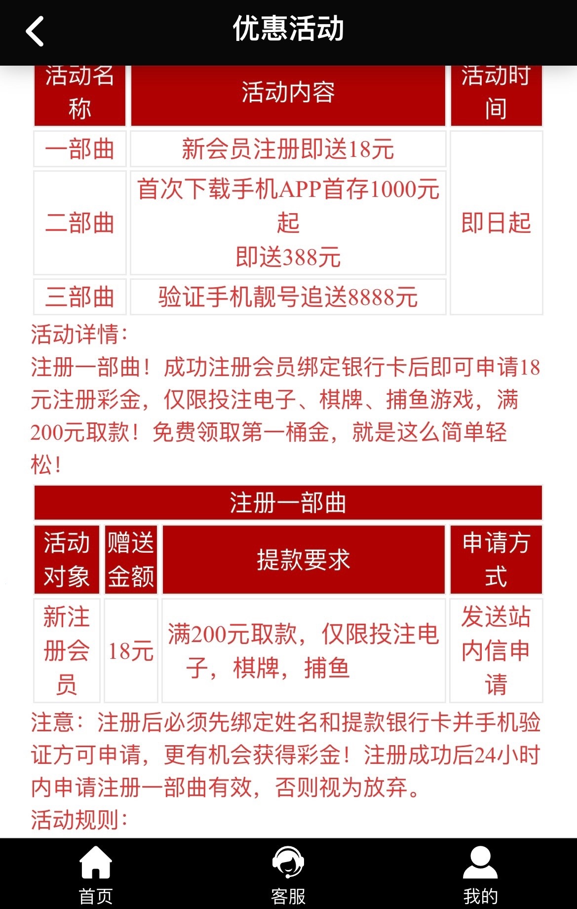 新用户注册完善个人信息绑定手机号及银行卡信息联系在线客服申请18彩金 满200提现