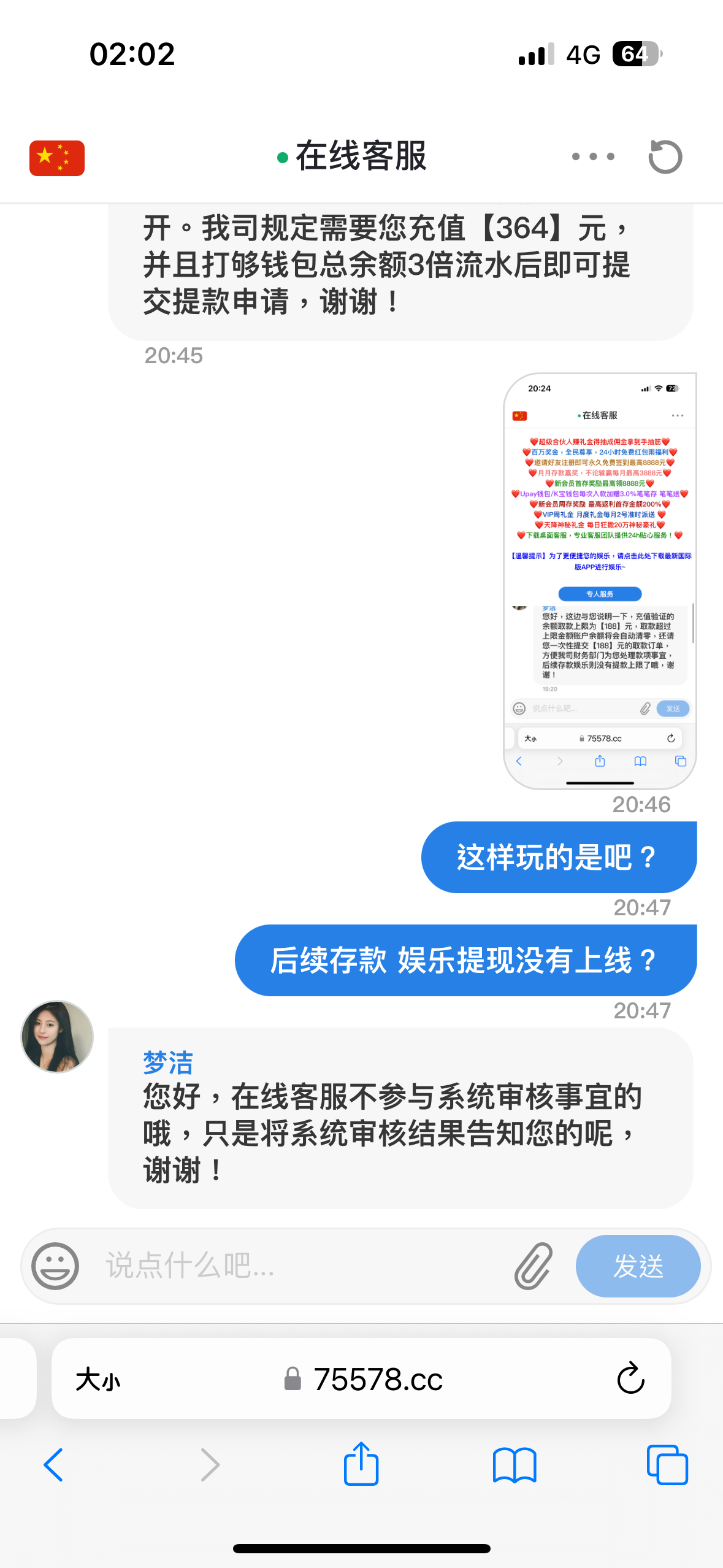 刚开始签到9块打水500提现退回 客服说充值100才能提现 充值了100提现500又全部扣剩下183 说只能提183 好嘛提183就183 没过一会充50打上350提现两百又被退回 结果又说要充值350加上账号上的350打3倍水 这尼玛真没格局 真的出生平台