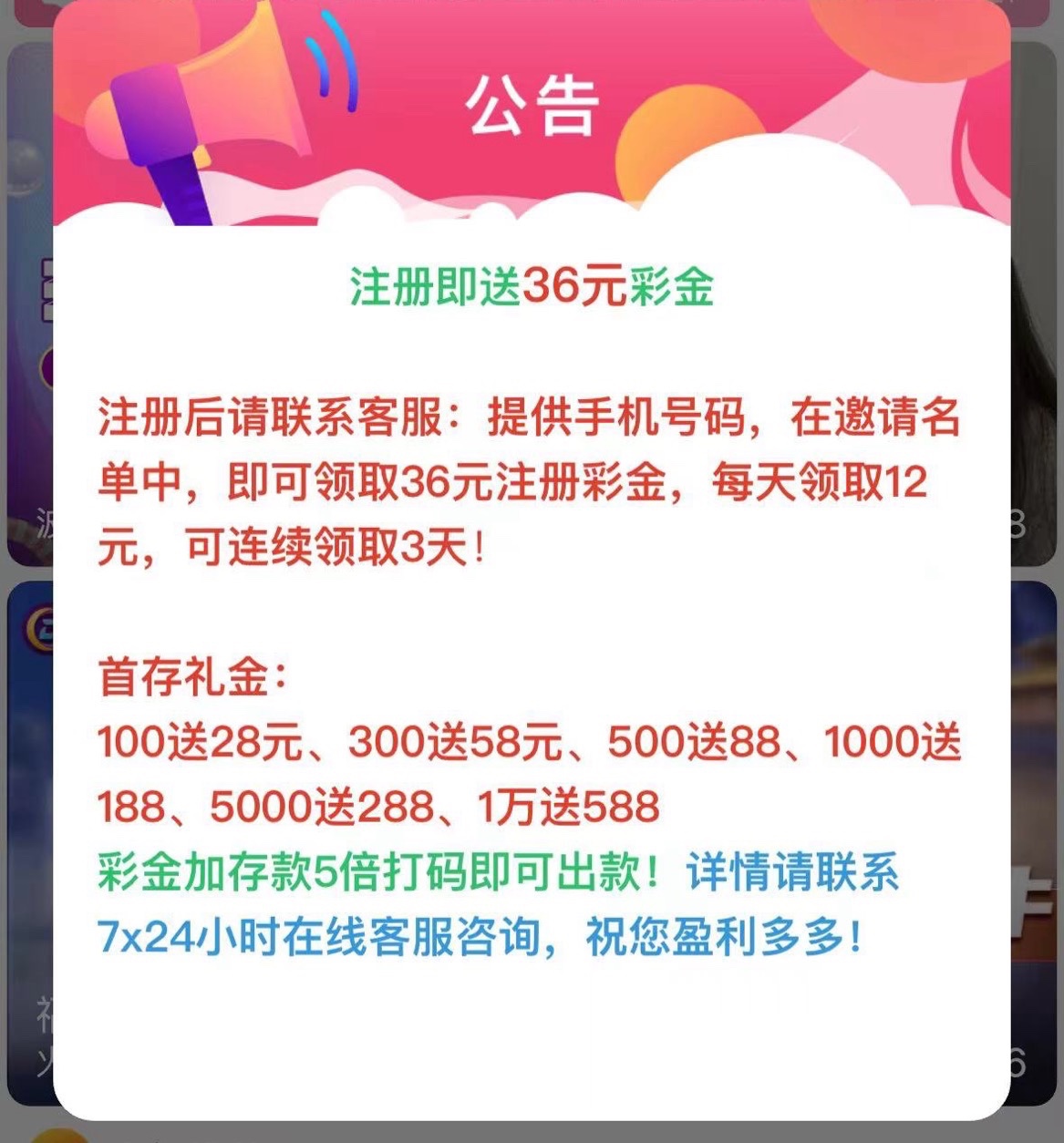 新用户注册找客服领取电话彩金 这种人少应该就不查。不让提现充个10块钱就可以了 具体自测。