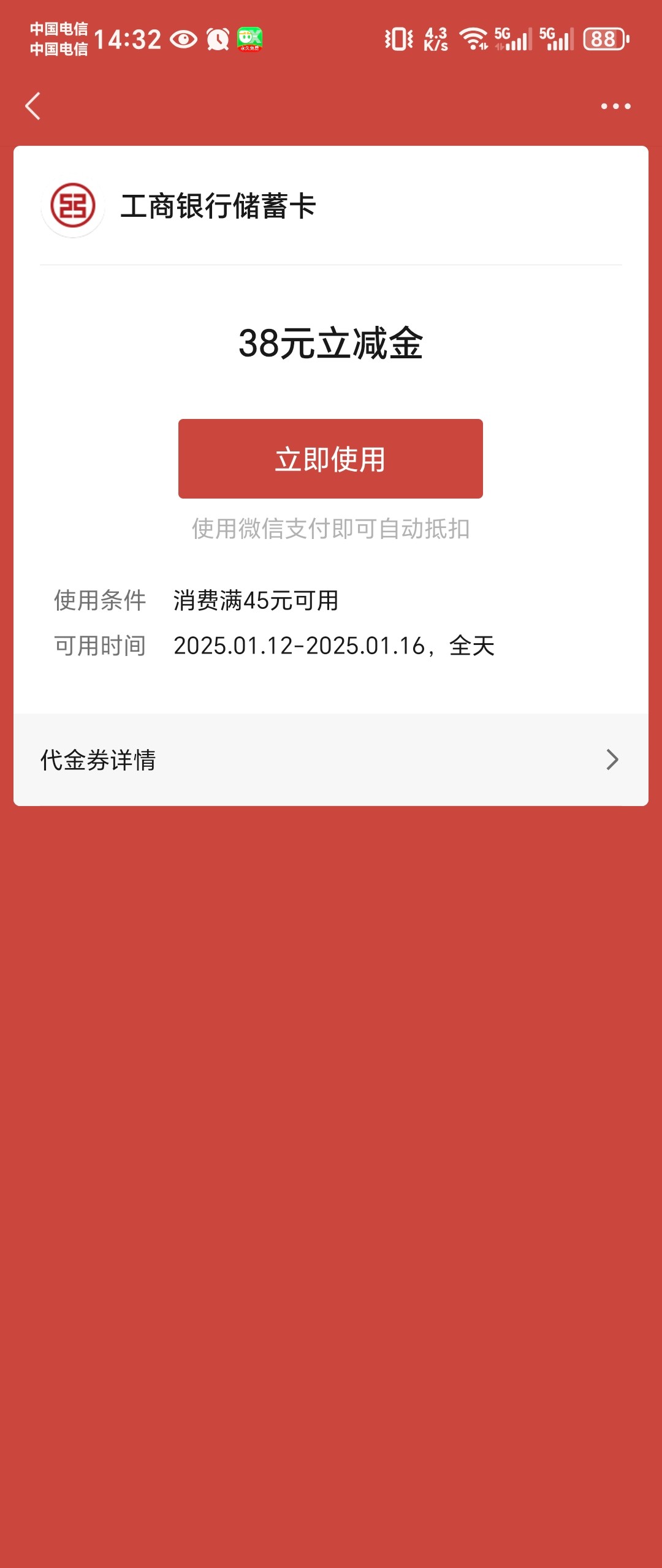 微信扫码打开或者搜微金融找到养老金开通领,可以买东西或者上分我领到了 38。其它银行应该也有这个活动老哥们可以去看看。没有工商卡的其他卡也可以