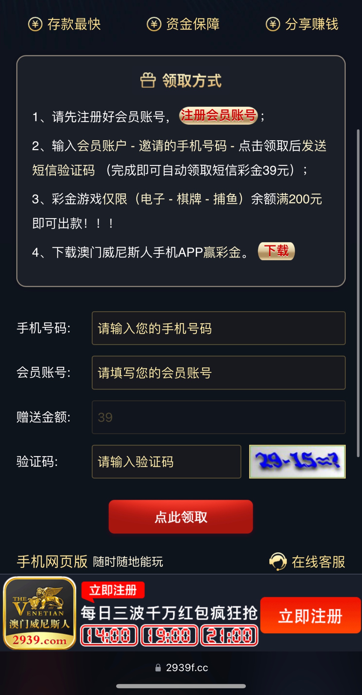 活动:新用户注册账号,返回原来链接自助填写账号手机号碰瓷申请特邀彩金送39/100提