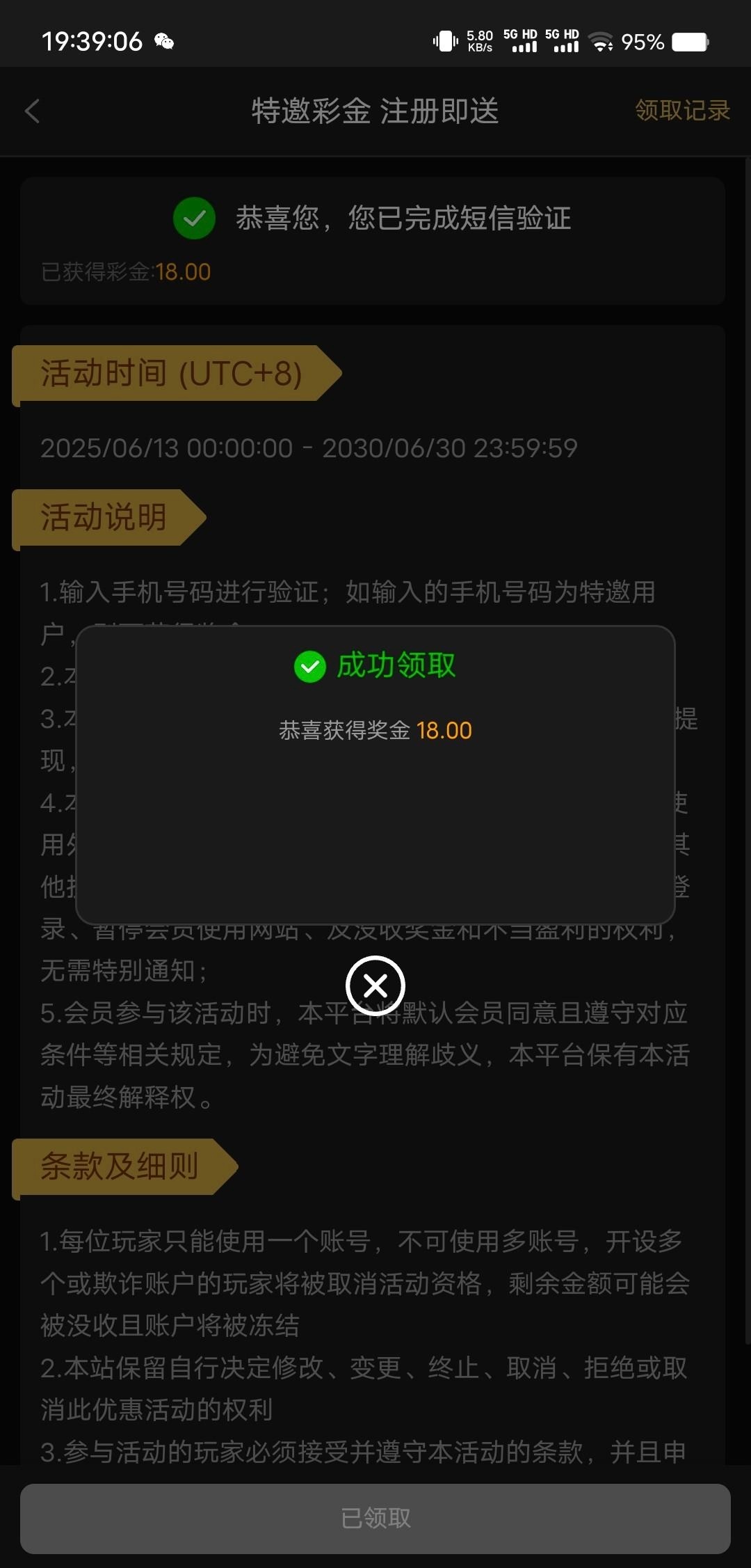 自助特邀彩金 我领到18了