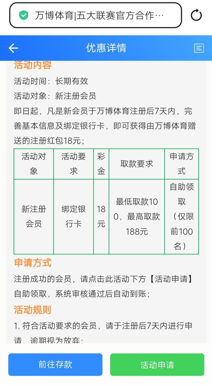 万博体育注册后7天内,完善基本信息及绑定银行卡,即可获得由万博体育赠送的注册红包18