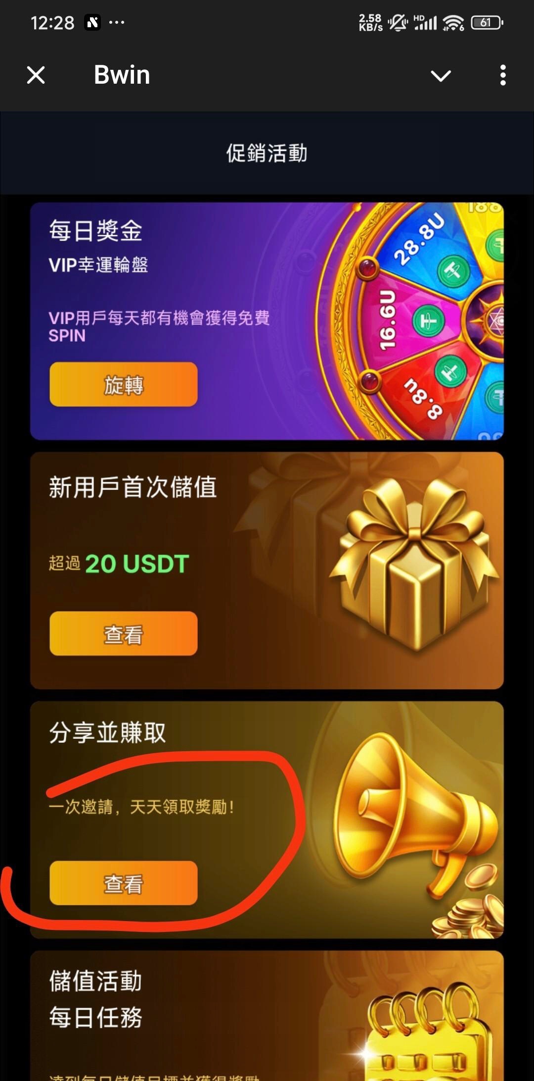机器人@bwin,注册账号登录,点最下面促销活动,点第三个分享并赚取,然后加入频道返回领10,活动每日空投领3