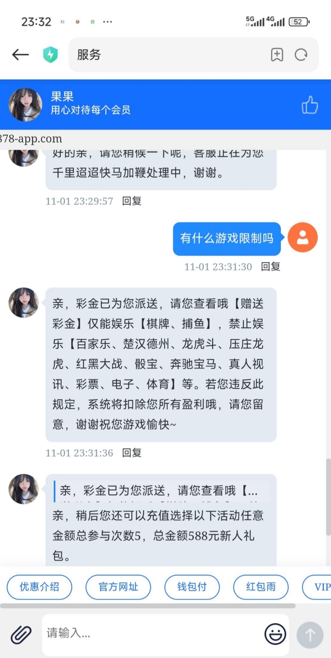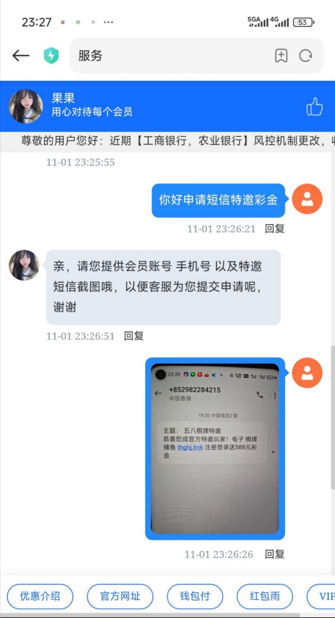 注册找客服领取短信特邀彩金,给了58,短信图在下面,老哥们可以自己做一个或者直接用,只能打棋牌捕鱼,不能打红黑这些,我没看清打红黑,后面退回,打完了,祝老哥们都能打出来网址 thghj.link