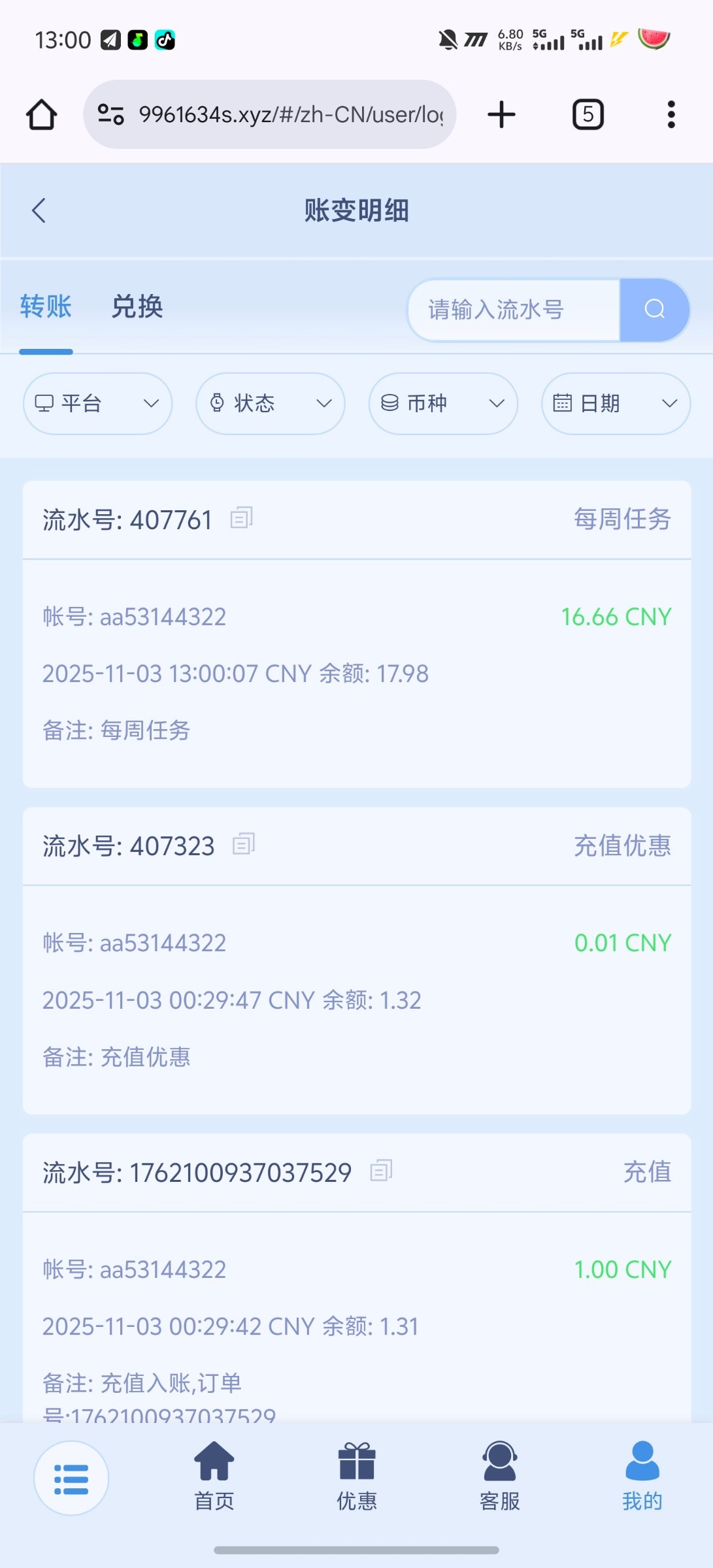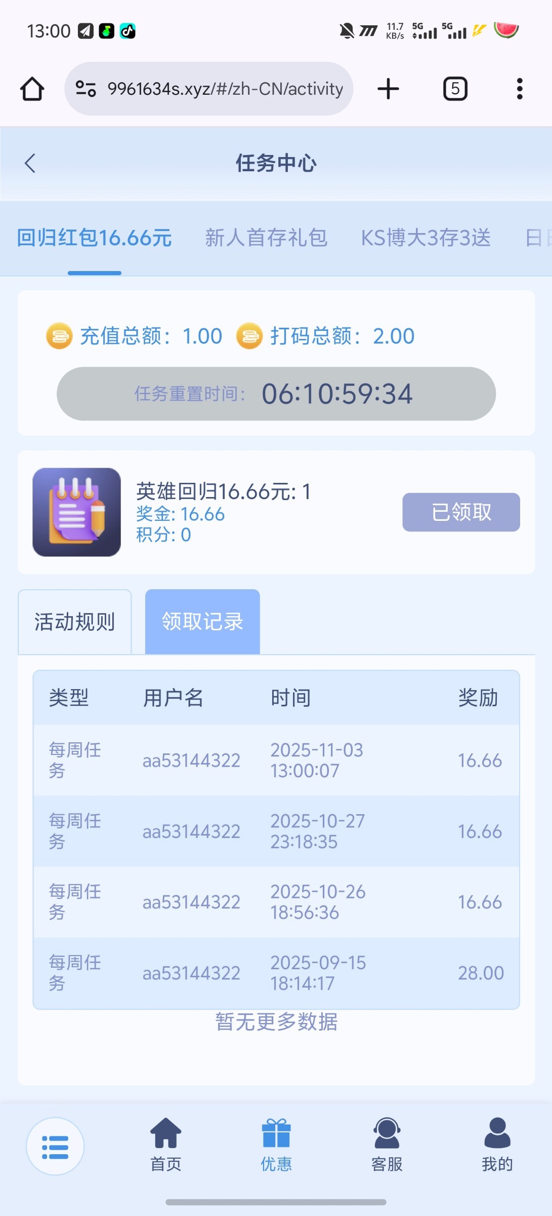 每周余额里留1块钱。每周一去,随便打一个1块注,等一个小时或者两个小时。去活动页面里。16.6链接:MT135.com