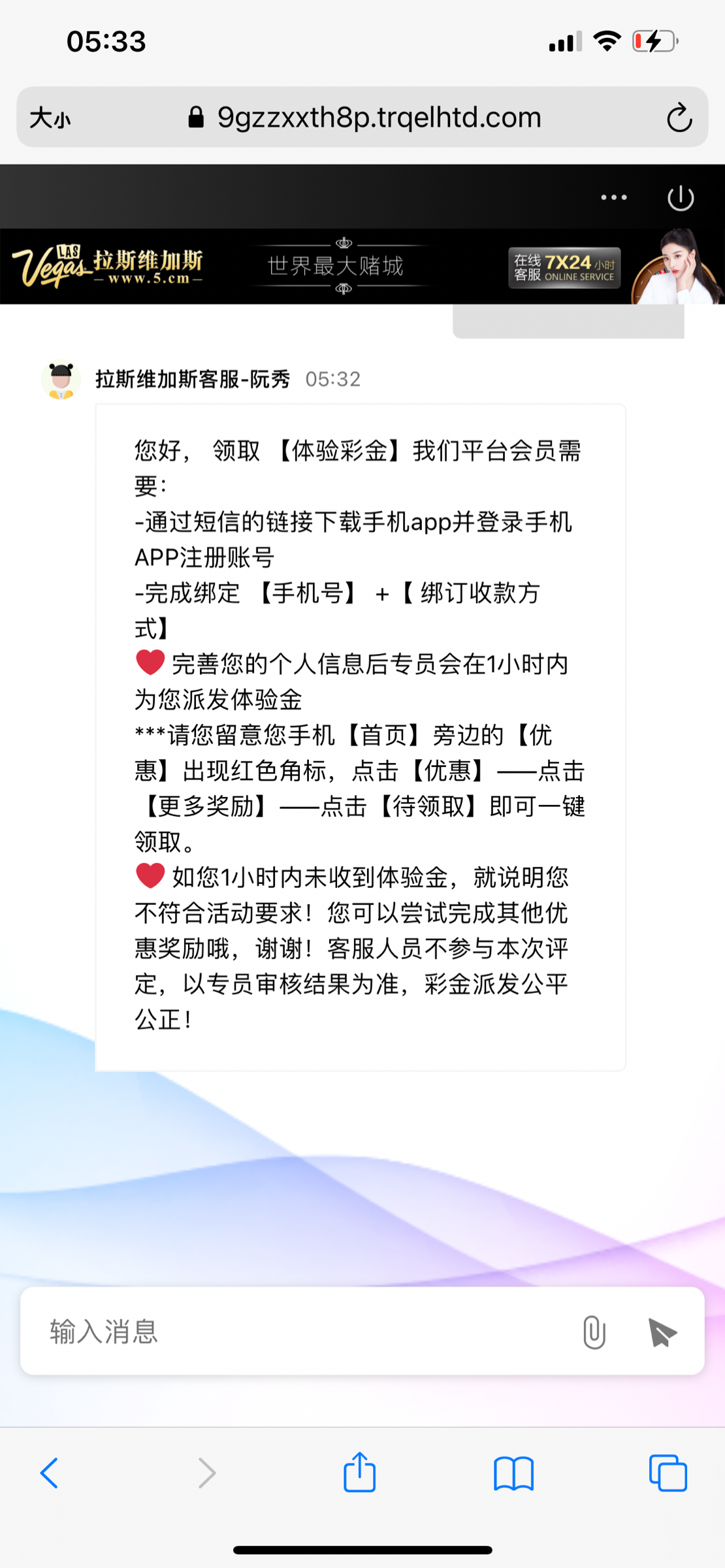 打电话让我注册说送彩金,要下载app,我懒得下了就没弄,不懒的去试试5001.com