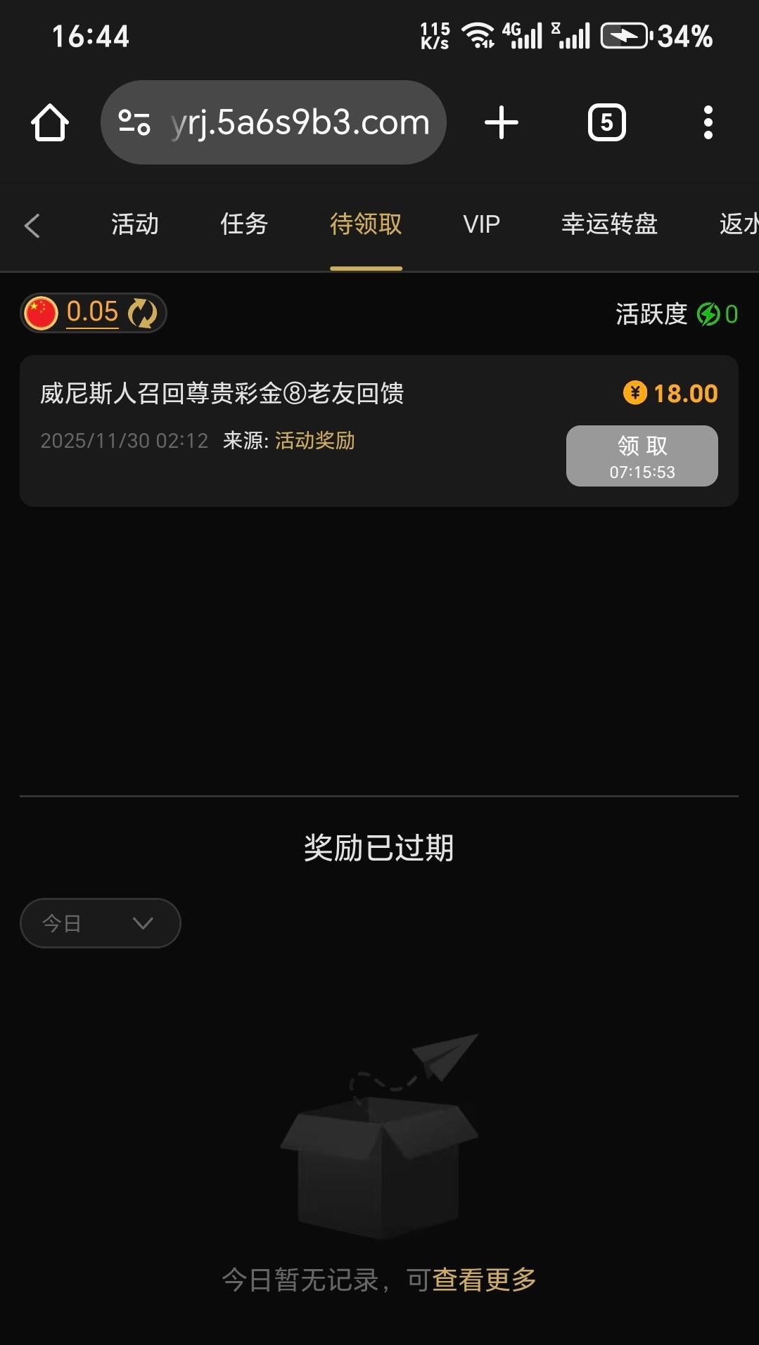 网址392.com 以前充值过,最近没充,晚上12点可以领取,待领取查看即可