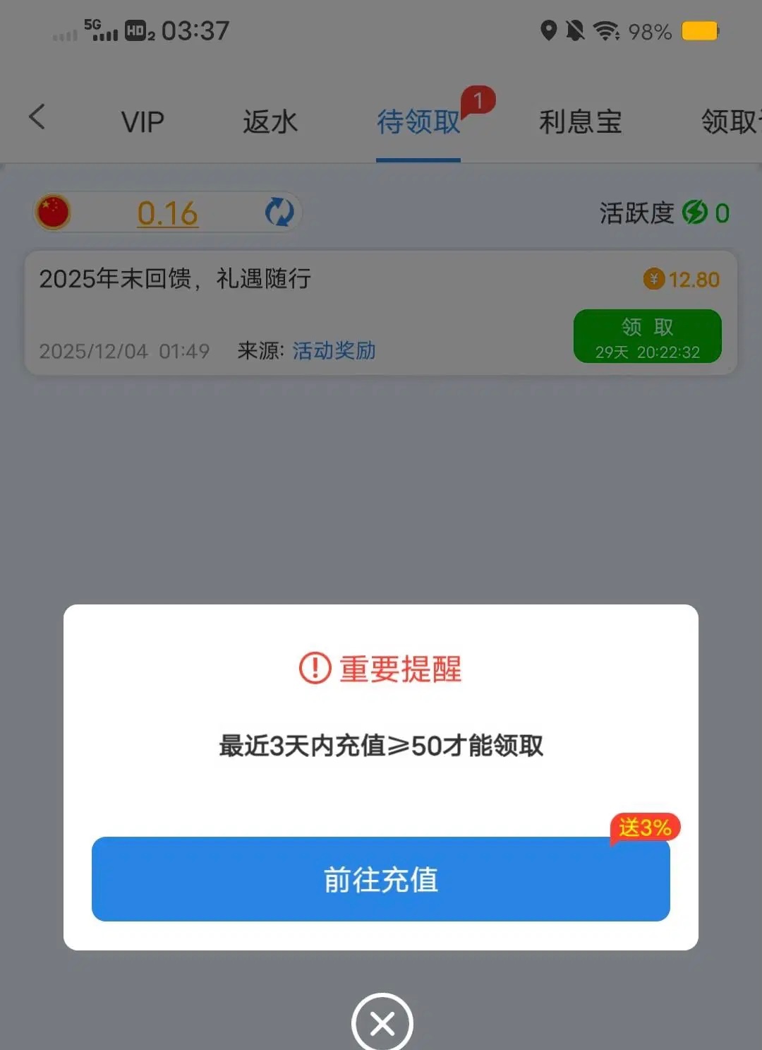 262.com 上号看见能领12块8彩金,但是要最近三天有充值≥50元以上的可以去看看,我262没赢过,不会充了(严禁充值!)