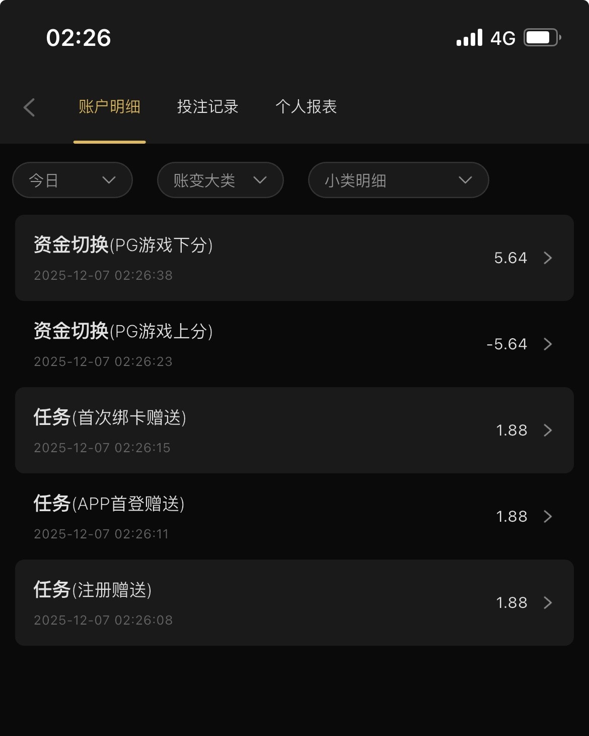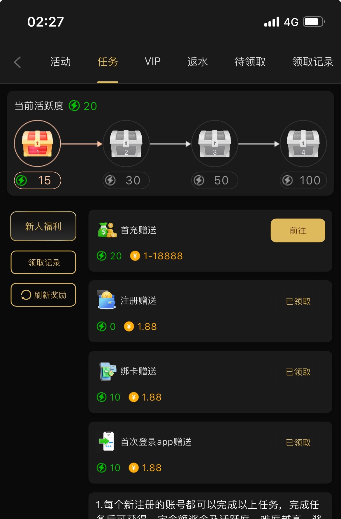 注册送任务里自助领取5.6 赌神项目