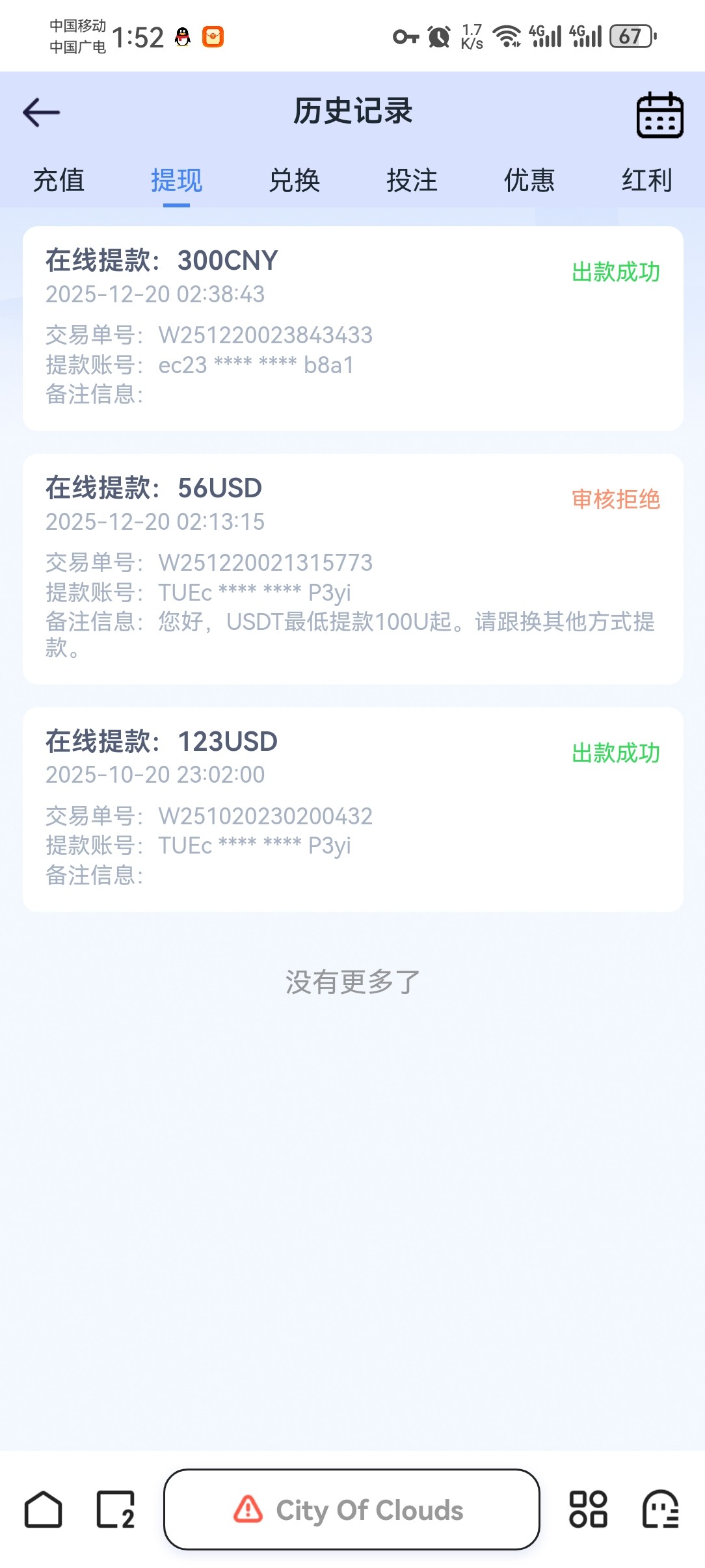 不知道什么合并彩金,送了0.71u,之前干了一次100+100几个月没玩了,昨晚看到其他人说有上去领了0.71u*7.1=5.041块打到497提u要100u想打到700结果死了只出了300k豆