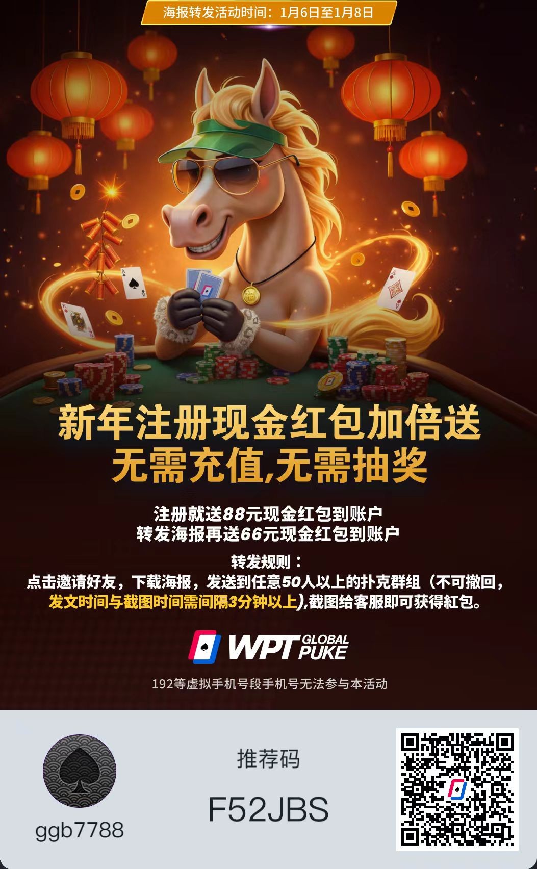 本站声明 1、本帖标题:德州扑克送88+66